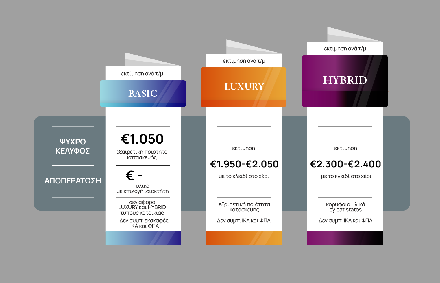 Δε συμπεριλαμβάνει: εκσκαφές, ΦΠΑ και ΙΚΑ.